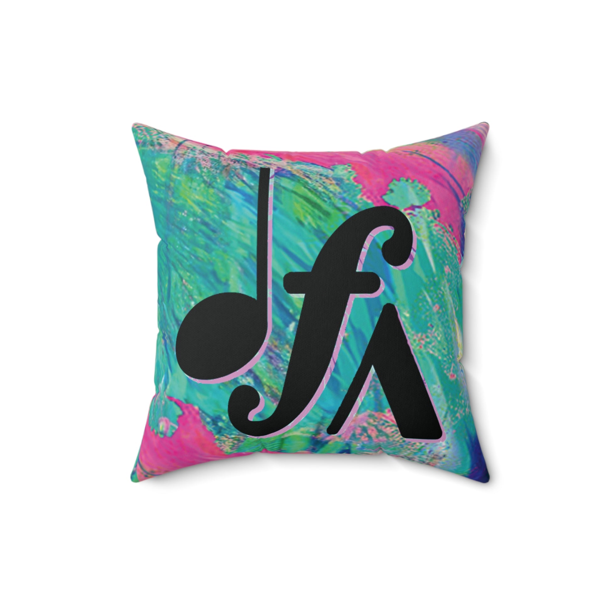 Bright, expressive throw pillow with a hand-painted, swirled background in bubblegum pinks, aqua and lime. A bold, black music-themed monogram sits front-and-center, giving the design an art-student, indie-studio vibe. It brings color and personality to a practice corner, dorm bed, or living room couch. The double-sided print keeps the pattern vibrant from every angle. Lightweight spun polyester holds crisp colors and resists wrinkles, so the pillow stays lively without extra care. When assembled, the generously sized recycled polyester insert fills the cover to create a plump, tactile cushion that begs to be hugged, leaned against, and shown off during casual gatherings or late-night listening sessions.
